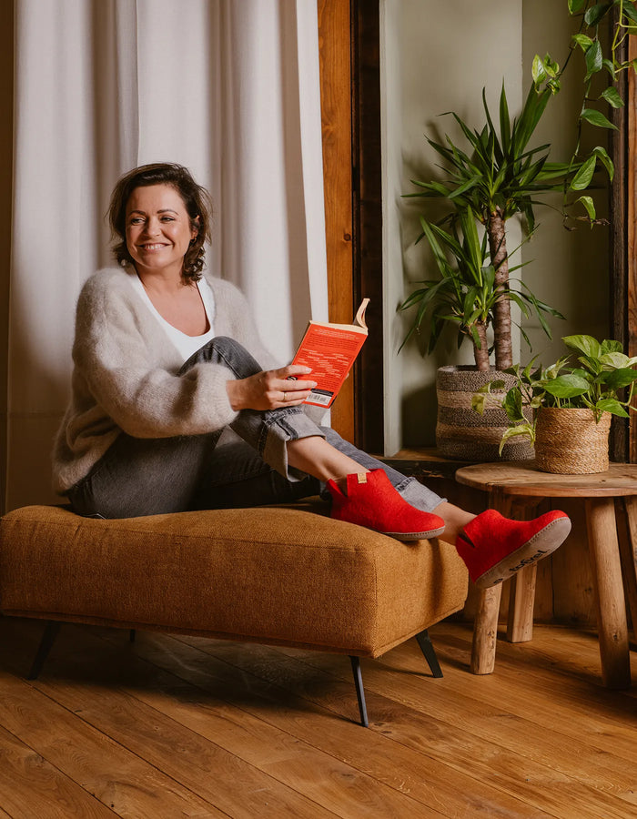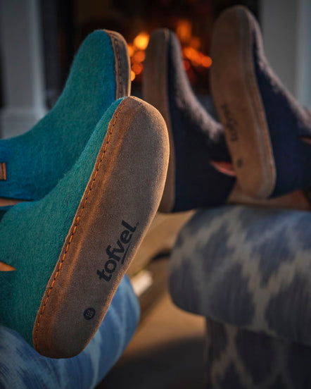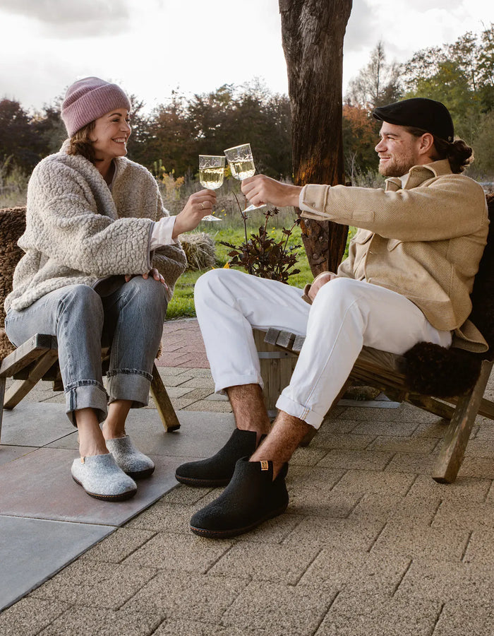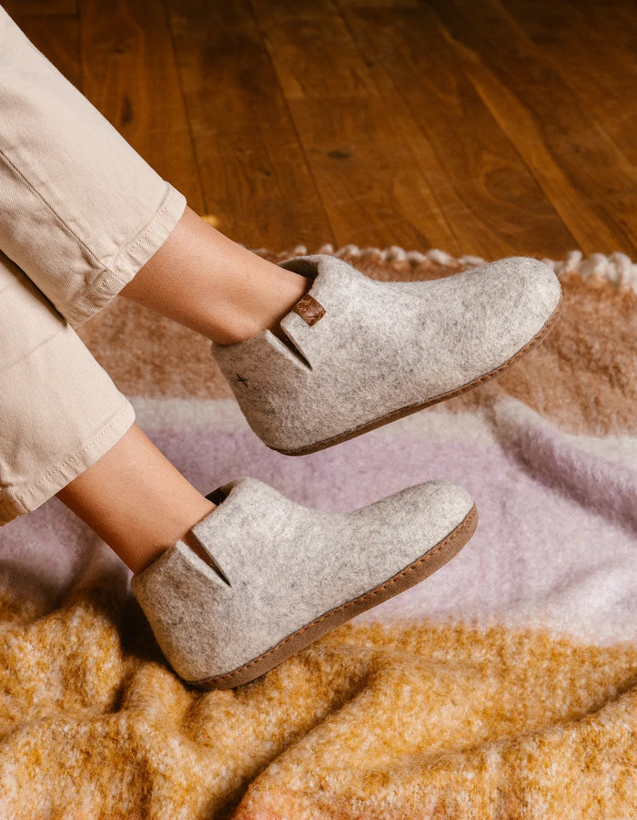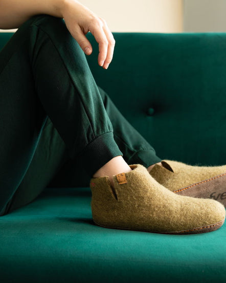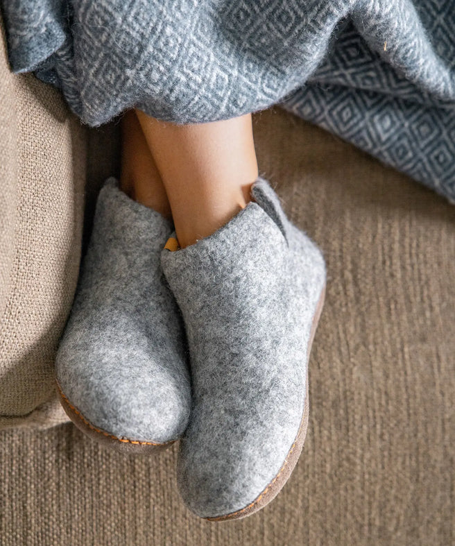 Het wolvilt houdt de voeten warm tijdens koude dagen, maar heeft een verkoelende werking tijdens warmere dagen. Voor optimale duurzaamheid en grip wordt de onderzijde afgewerkt met een kalfsleren of rubberen zool.