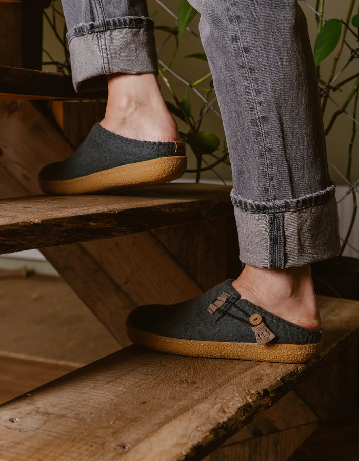 Onze producten zijn duurzaam en milieuvriendelijk vervaardigd. Onze wol wordt handmatig gewassen zonder chemicaliën. Voor de zool wordt gebruik gemaakt van 100% plantaardig gelooid leer. Het rubber is gedeeltelijk gerecycled en we gebruiken een natuurlijke lijm zonder oplosmiddelen.